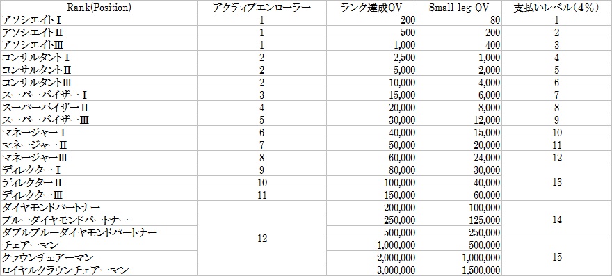 ・Small LEG=自分が紹介して会員となった人たちをダウンと呼ぶが、その人たちを連なった表にしたとき、一番大きな列を除いたものをひとつの列としてまとめて考える。この大きな列のOVと、まとめた列のOVを比較したときに小さいほうの列をスモールレッグと呼ぶ。